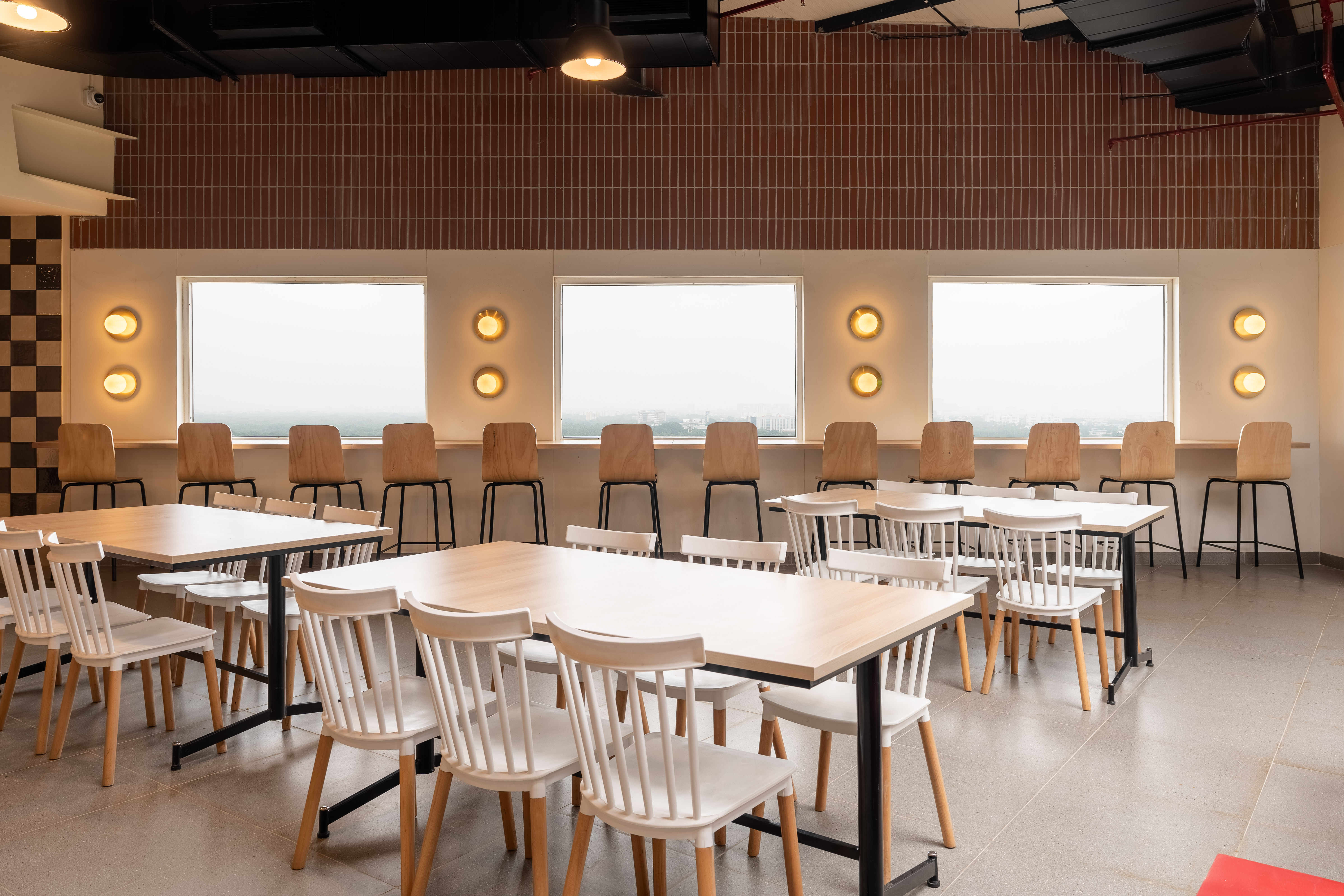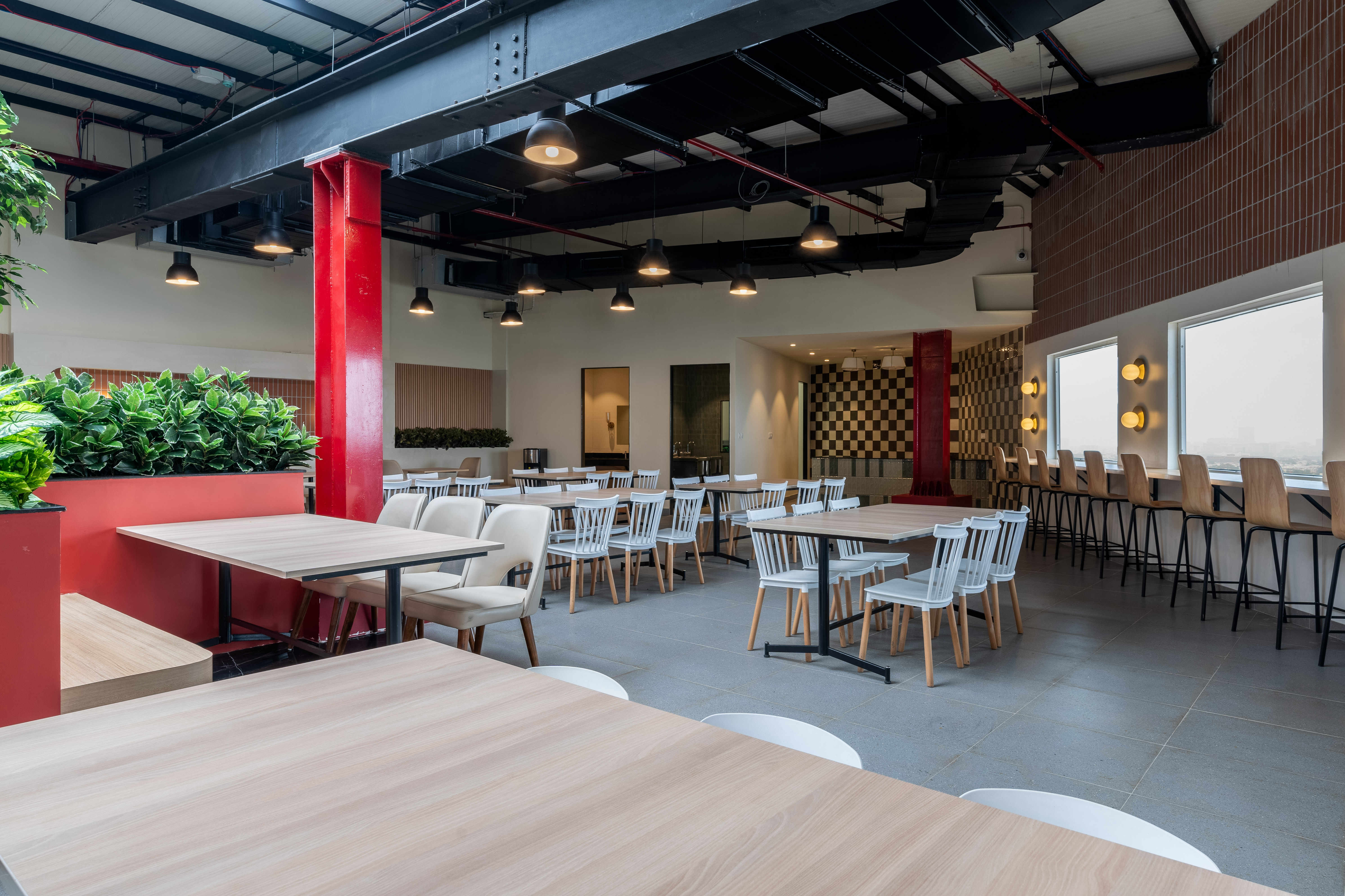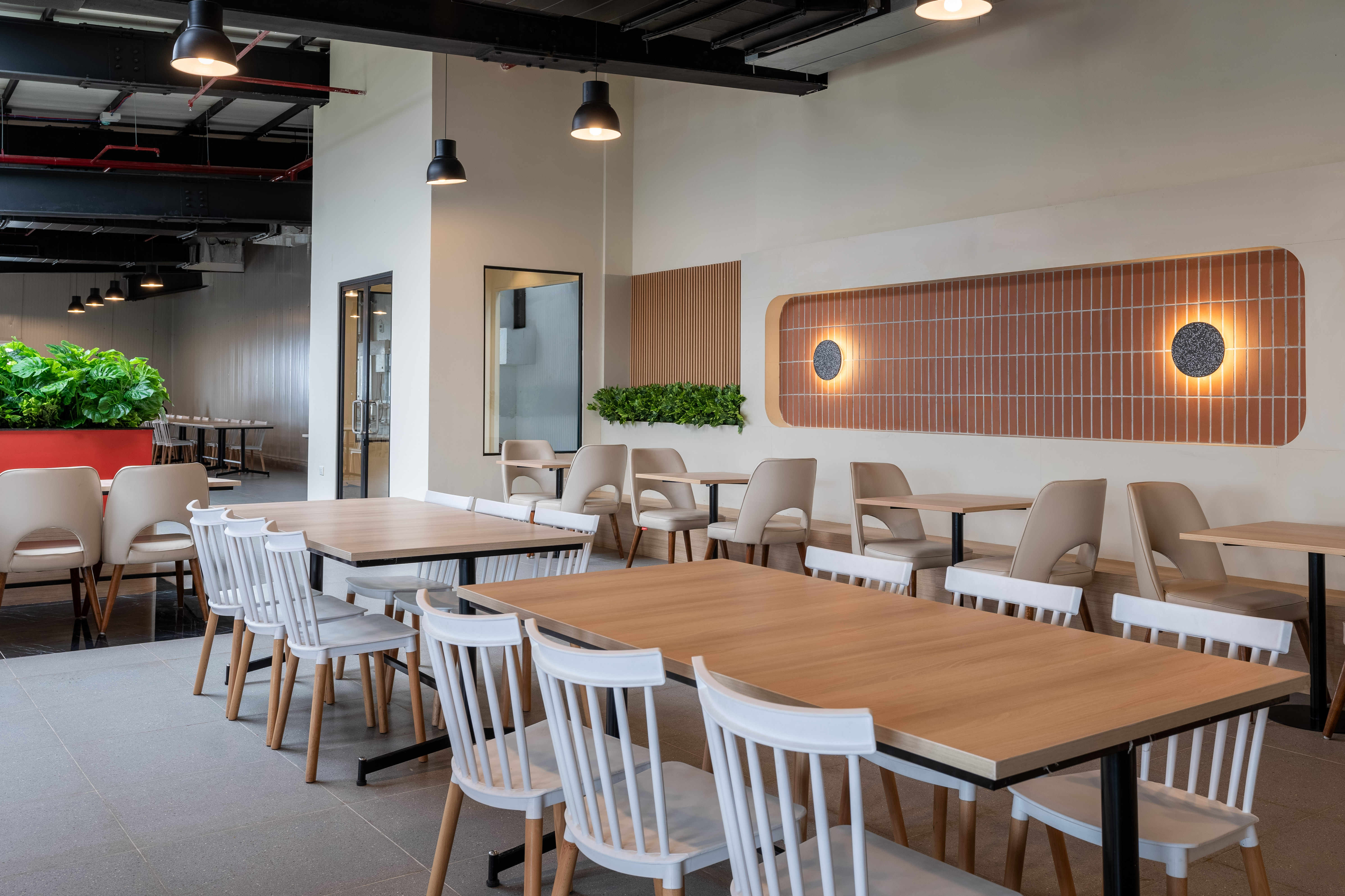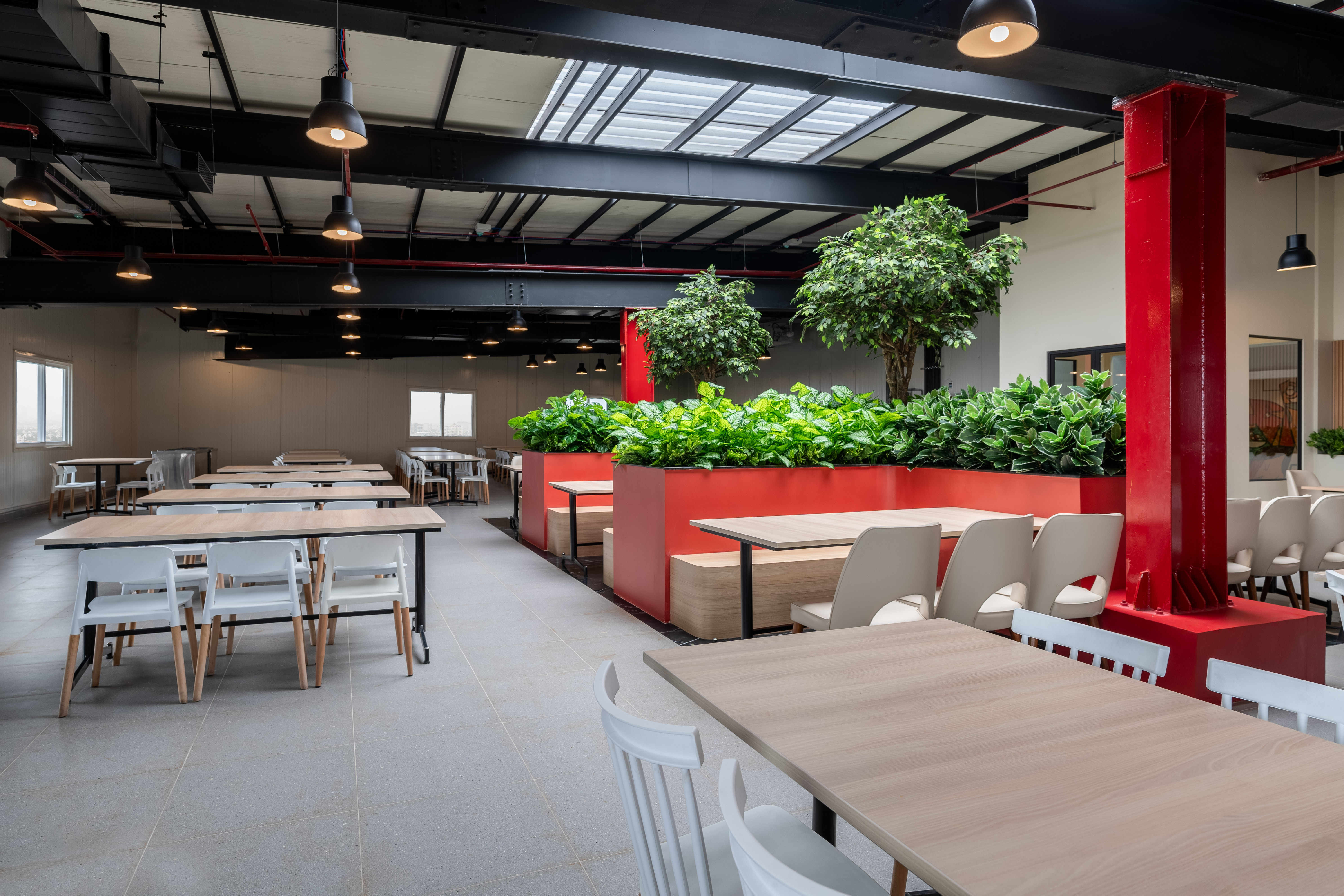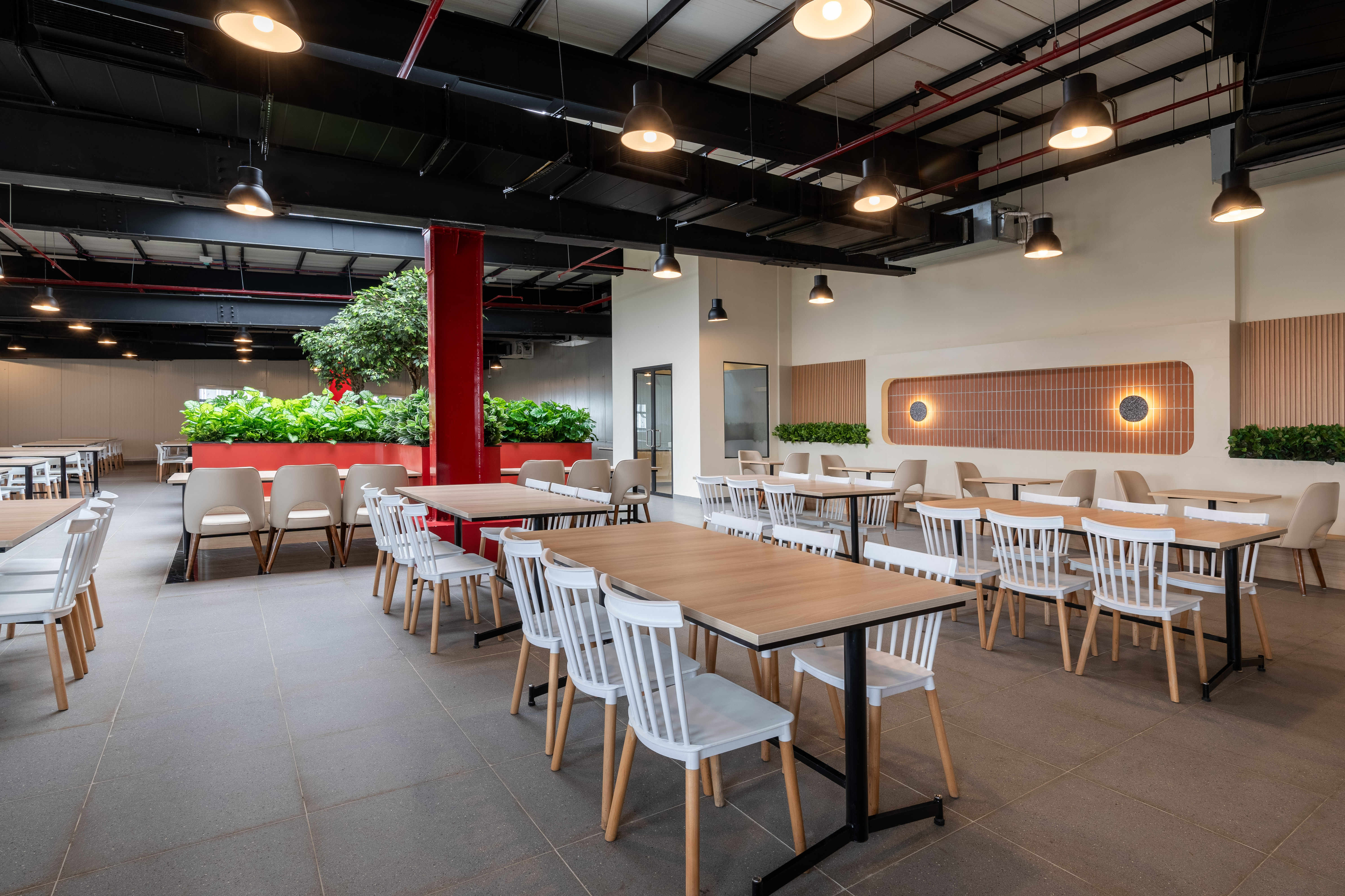Designed across 10,000 sq. ft., this vibrant cafeteria space combines function, comfort, and durability. The layout includes drywall and aluminium partitions, varied ceiling formats—such as curved, circular, and baffle metal ceilings—and full-scope painting for a clean finish. Textured tiling on walls and floors adds visual warmth, while flush and fire-rated doors provide safety across zones. Built-in bench seating offers space-saving utility and supports social interaction. The result is a relaxed, inviting break zone that complements workplace energy.