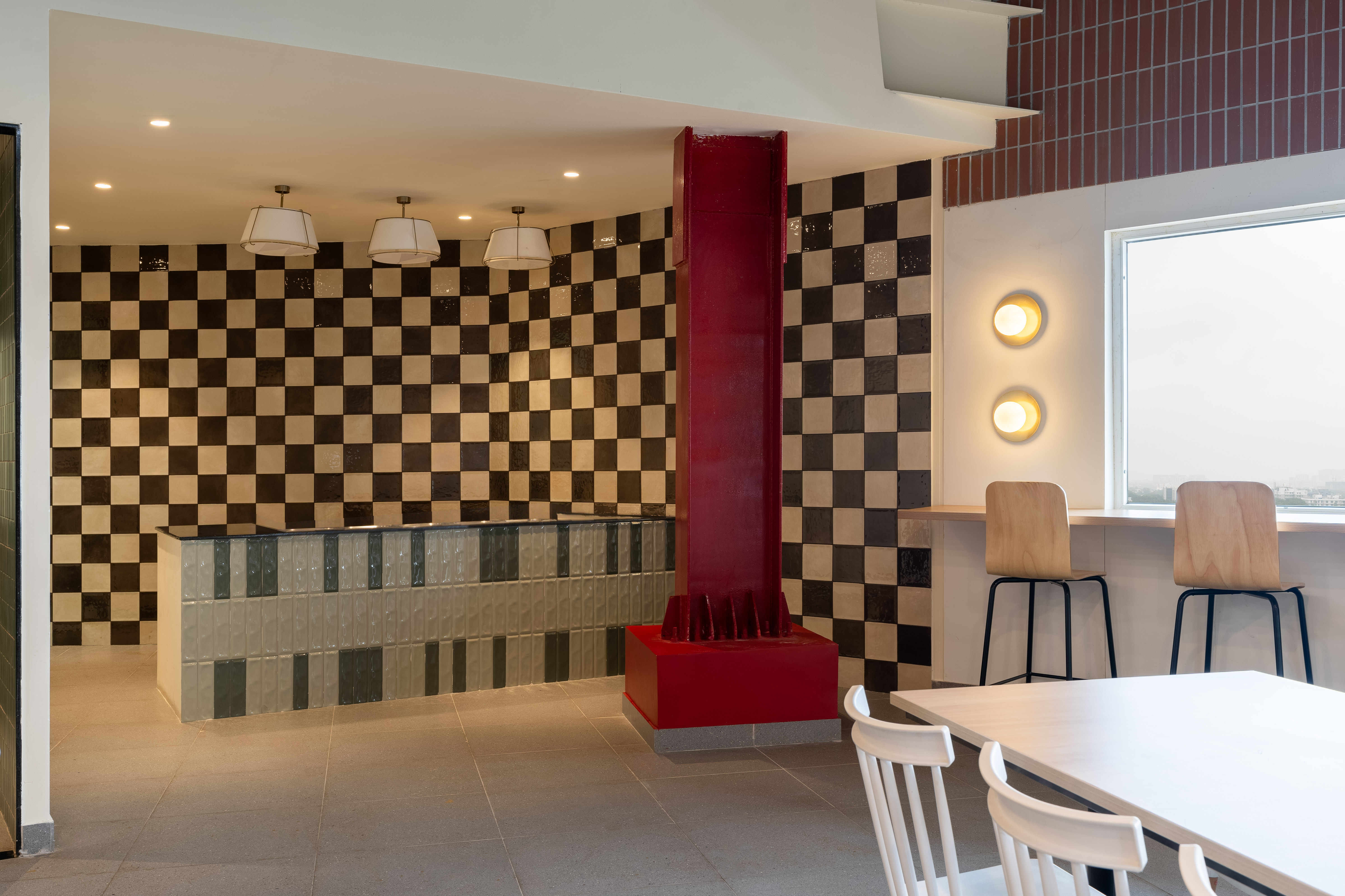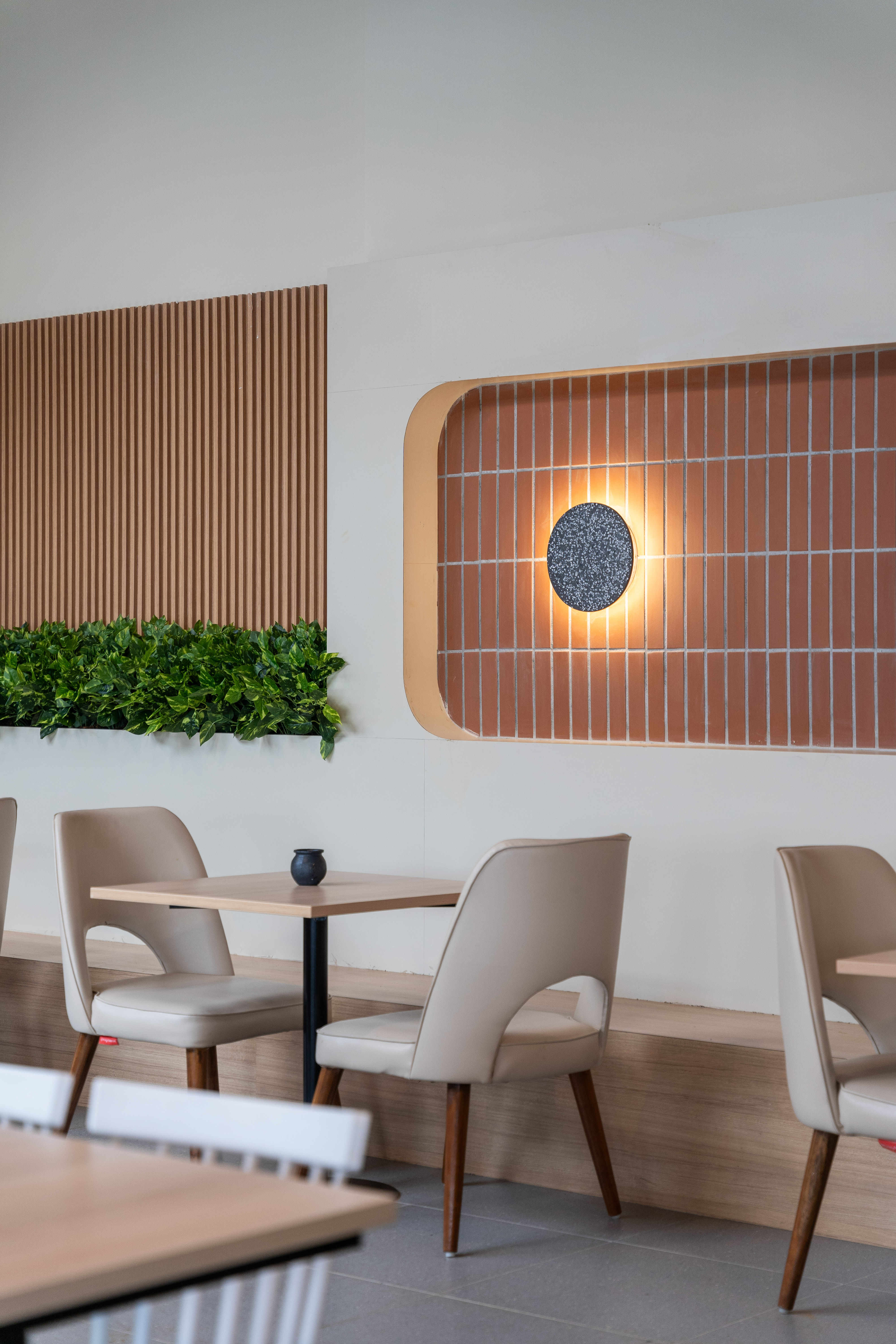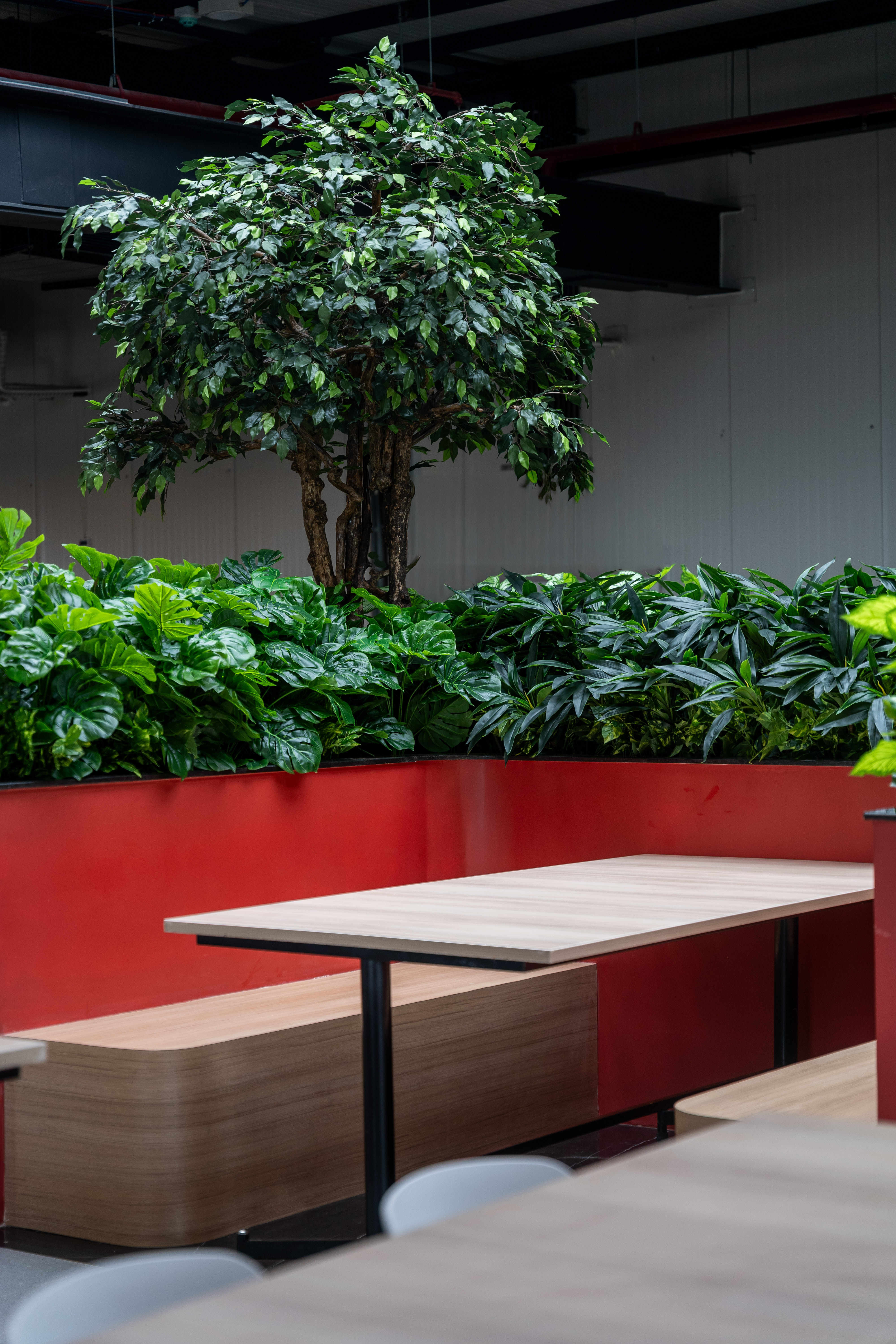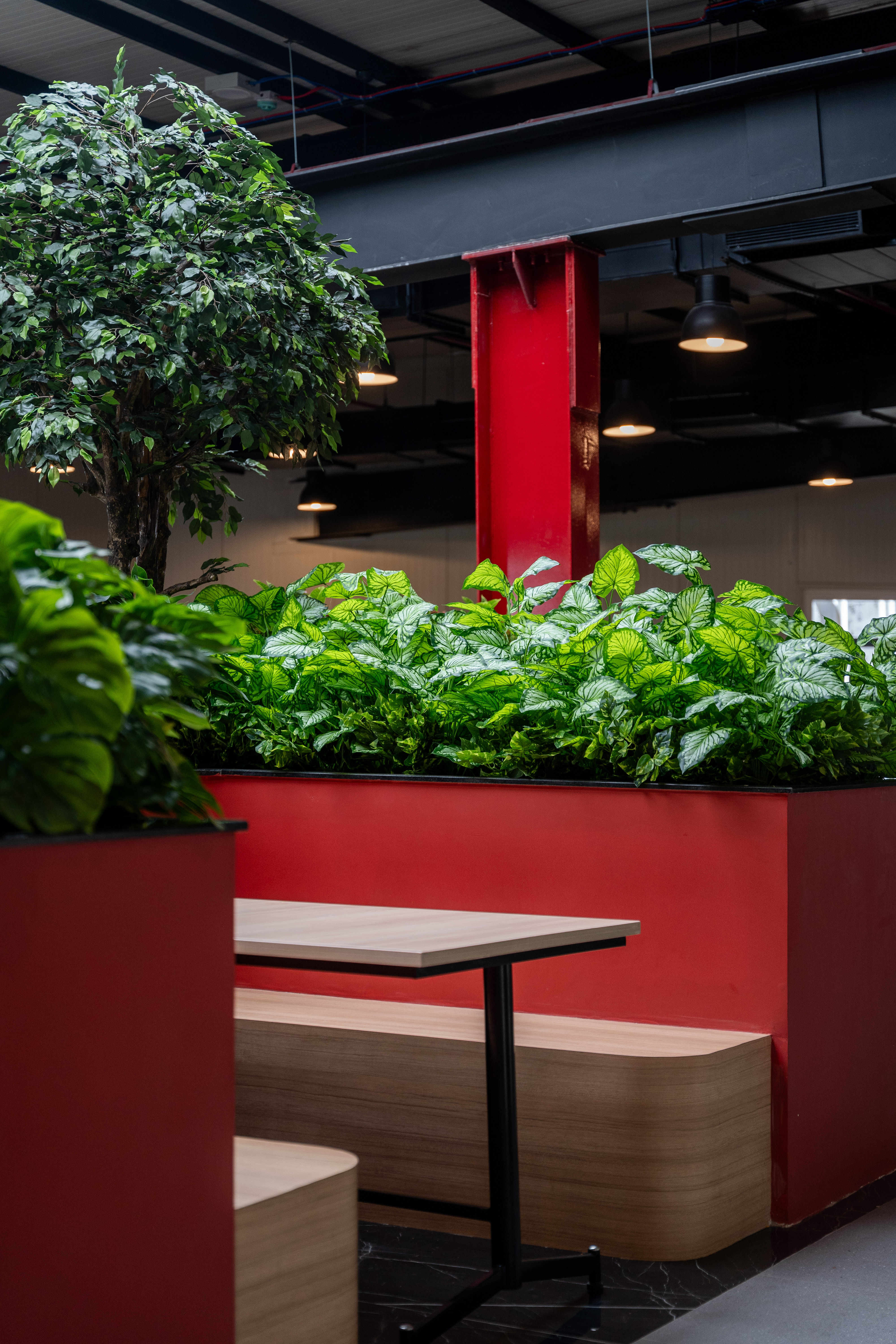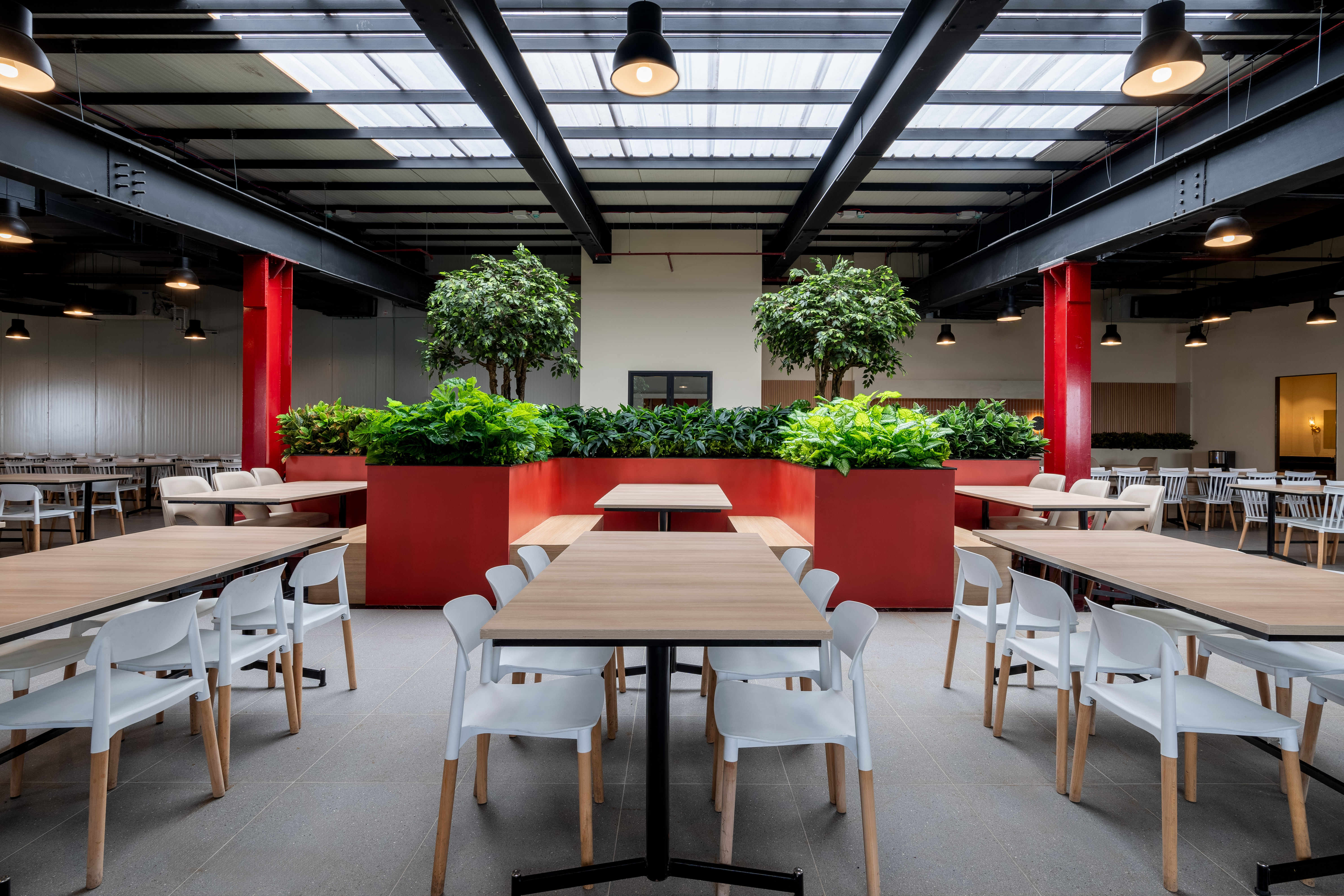 Designed across 10,000 sq. ft., this vibrant cafeteria space combines function, comfort, and durability. The layout includes drywall and aluminium partitions, varied ceiling formats—such as curved, circular, and baffle metal ceilings—and full-scope painting for a clean finish. Textured tiling on walls and floors adds visual warmth, while flush and fire-rated doors provide safety across zones. Built-in bench seating offers space-saving utility and supports social interaction. The result is a relaxed, inviting break zone that complements workplace energy.